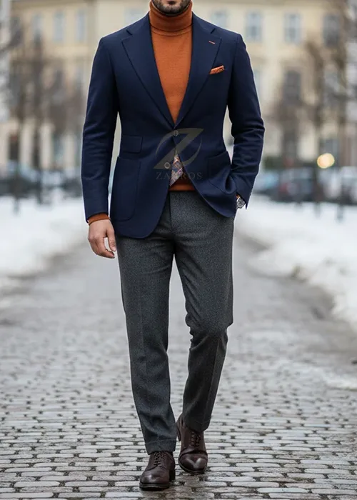 - مثال استایل: یک کت تک سرمهای از زاگرس پوش را با یک پلیور یا یقه اسکی نارنجی سوخته و شلوار پارچهای طوسی یا سرمهای ست کنید. این ست کت و شلوار زمستانی، با اضافه کردن یک اکسسوری نارنجی، بسیار برجسته خواهد شد.