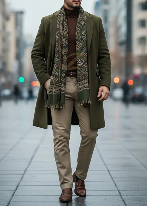 - مثال استایل: یک کت یا پالتوی پشمی سبز زیتونی را با یک پیراهن یا بافت نازک قهوهای شکلاتی و شلوار کتان کرم یا شتری بپوشید. این ترکیب برای یک لباس زمستانی شیک و کاربردی ایدهآل است.