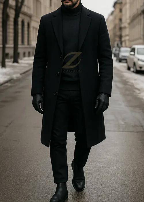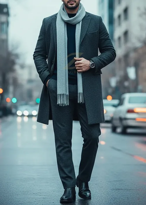 - مثال استایل: یک پالتوی مشکی بلند را با یک یقه اسکی یا پلیور ذغالی و شلوار فلانل مشکی یا جین تیره ست کنید. این ست زمستانی، ظاهری جدی و در عین حال جذاب به شما میدهد.