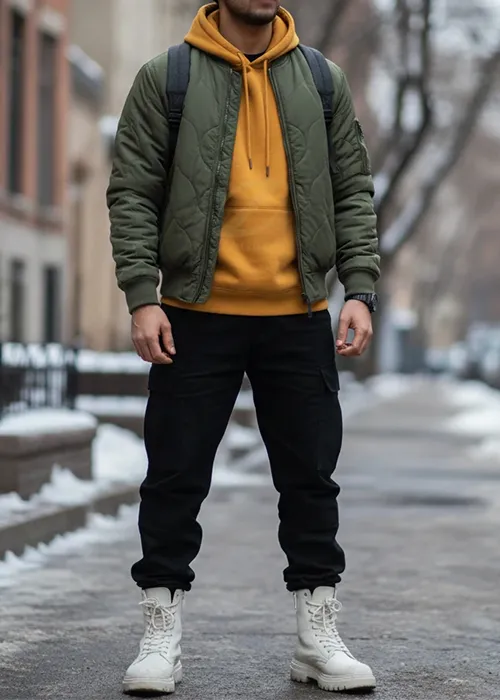 - مثال استایل: یک کاپشن یا کت سبز ارتشی (Bomb-style) را با یک تیشرت یا هودی خردلی و شلوار کارگو مشکی یا کتان تیره ست کنید. این لباس گرم مردانه، به شما ظاهری مدرن و پویا میدهد.