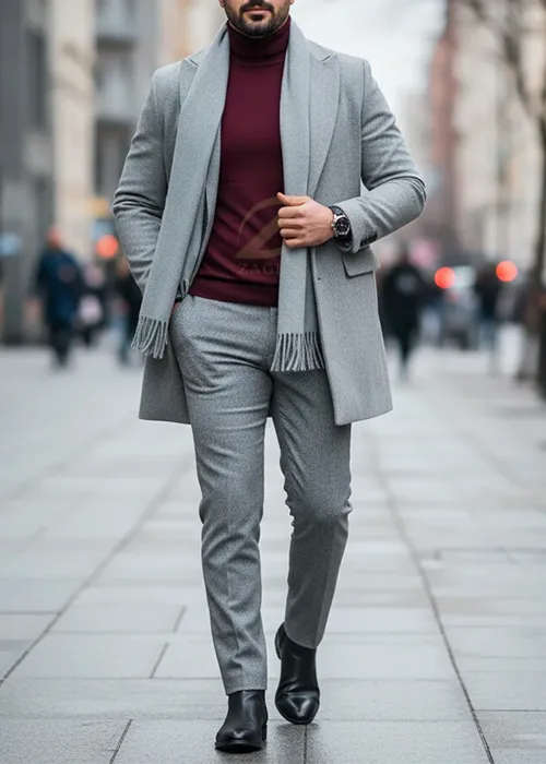 - مثال استایل: یک پلیور یقه اسکی زرشکی از زاگرس پوش را با یک پالتو یا کت خاکستری روشن و شلوار پارچهای طوسی یا فلانل ست کنید. این ست زمستانی، شما را هم گرم نگه میدارد و هم جلوهای خاص به ظاهرتان میدهد.