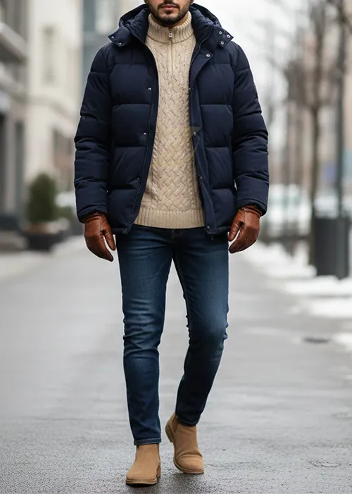 - مثال استایل: یک کاپشن یا پافر آبی نفتی را با یک پلیور بافت بژ کرمی و شلوار جین تیره یا شلوار پارچهای کرم ست کنید. این لباس گرم مردانه، هم شما را گرم نگه میدارد و هم ظاهری شیک ایجاد میکند.