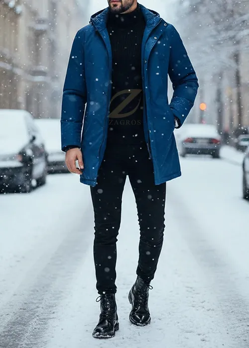- مثال استایل: یک پالتو یا کاپشن آبی کبالت را با یک یقه اسکی مشکی و شلوار پارچهای مشکی یا جین اسکینی ست کنید. این لباس گرم مردانه، به شما ظاهری بسیار شیک و جسورانه میدهد.