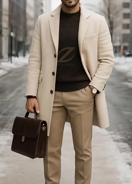 - مثال استایل: یک پالتوی کرم را با یک پلیور قهوهای تیره (شکلاتی یا نسکافهای) و شلوار پارچهای کرم یا بژ ست کنید. این لباس گرم مردانه، نه تنها شما را گرم نگه میدارد، بلکه ظاهری بسیار شیک و باکلاس به شما میدهد.