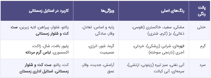 در جدول زیر، مروری بر پالتهای رنگی زمستانی و ویژگیهای هر یک ارائه شده است:
